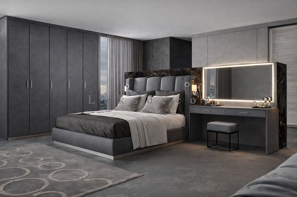 Karyola arkası mermer dokulu dekor ve 2 ad Lambader